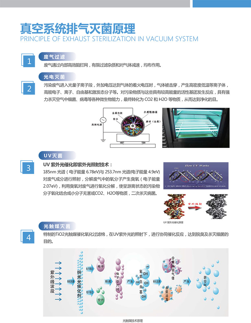 好凱德Hokaido顛排氣UV燈滅菌器采用光量子離子加紫外光催化氧化技術,利用介質阻擋放電產生高氧化活性離子體,再利用高強雙波段紫外強光結合光催化媒催化劑雙重技術處理排氣中的病毒、真菌、TVOC 等有害物質,以實現連續處置來自于醫院真空吸引系統排出的高度污染的高濕染毒廢氣,將其中可能夾帶的細菌、微生物、病毒以及氣溶膠等滅活后潔凈排放,可廣泛應用于各大醫院真空吸引系統染毒廢氣的排放治理。